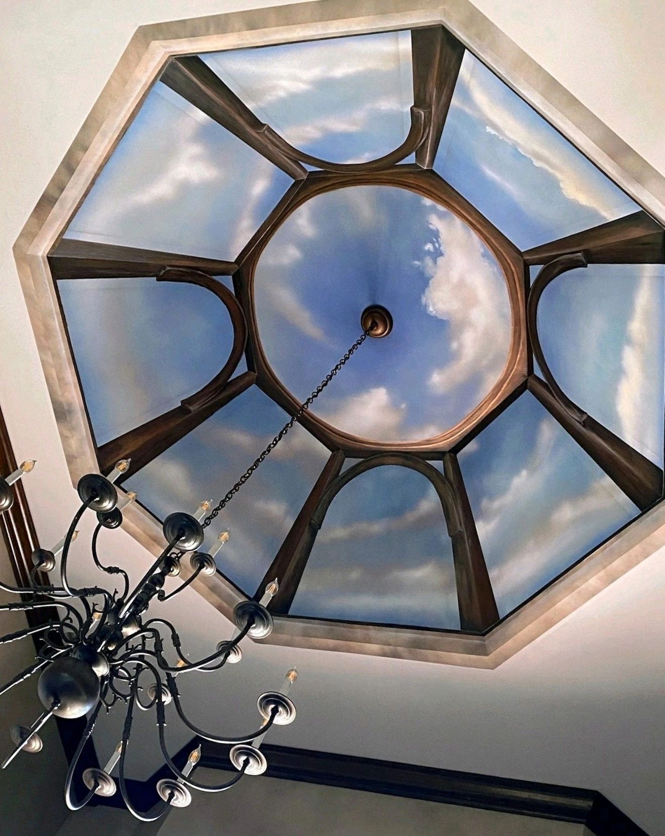 Painted Skies on the ceilings and dome area, decorative painted soffits to look like coppery-bronze to complete the design pulling together the columns and mosaic tile, walls, and faux marble on the concrete fireplace and columns throughout the room. Indoor/Outdoor Swimming Pool Recreation and entertainment two million dollar addition to a residential home in Hardin Valley, Tn. The project referral and sky inspiration over the pool came from Artist Cheryl Travis, thank you.